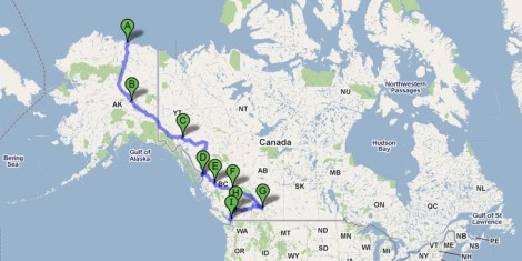 A= Prudhoe Bay, B= Fairbanks, C= Whitehorse, D= Hyder, E= Smithers, F= Prince George, G= Canmore, H= Lillooet, I= Vancouver